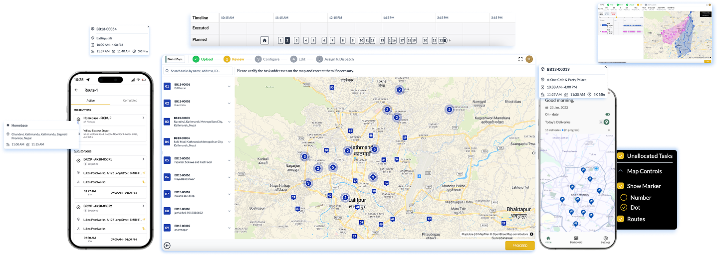 Route360 supports importing daily orders using a spreadsheet after which the address can be geocoded using the Baato API. It provides features to manage daily orders, depots, and riders, as well as breaking down service areas into multiple zones. It supports modeling for capacity constraints (specifying capacity and demand of pickup/delivery), time windows (specifying time within which service must be delivered), load times and service times, and en-route pickup and delivery. It also supports adding operating hours and rider breaks as per business requirements.